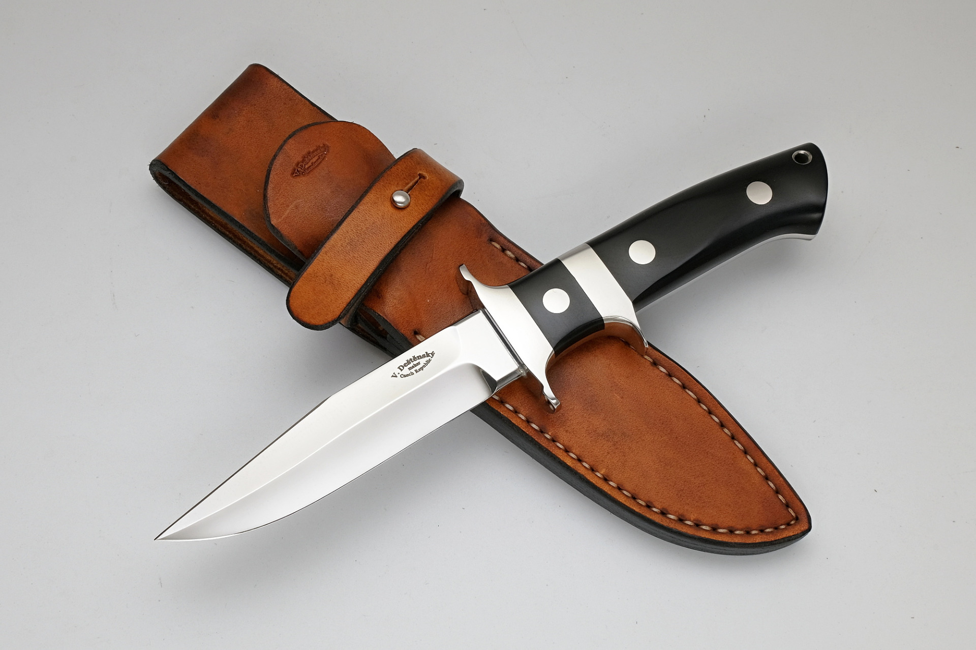 Ocel (steel) : N690Co. 5,2mm. (0.2 "), 60HRc Celková délka (total length) : 225mm. (8.85 ") Délka čepele (blade length) : 103mm. (4") Výbrus (grind) : dutý (hollow) Rukojeť (handle) : richlite - brown / fiber paper red Záštita (guard) : nerez ( stainless steel ) Loveless šrouby (bolts) : nerez ( stainless steel ) Pouzdro (sheath) : ručně šité z hovězí kůže - pravák (Cow leather for right-handed)