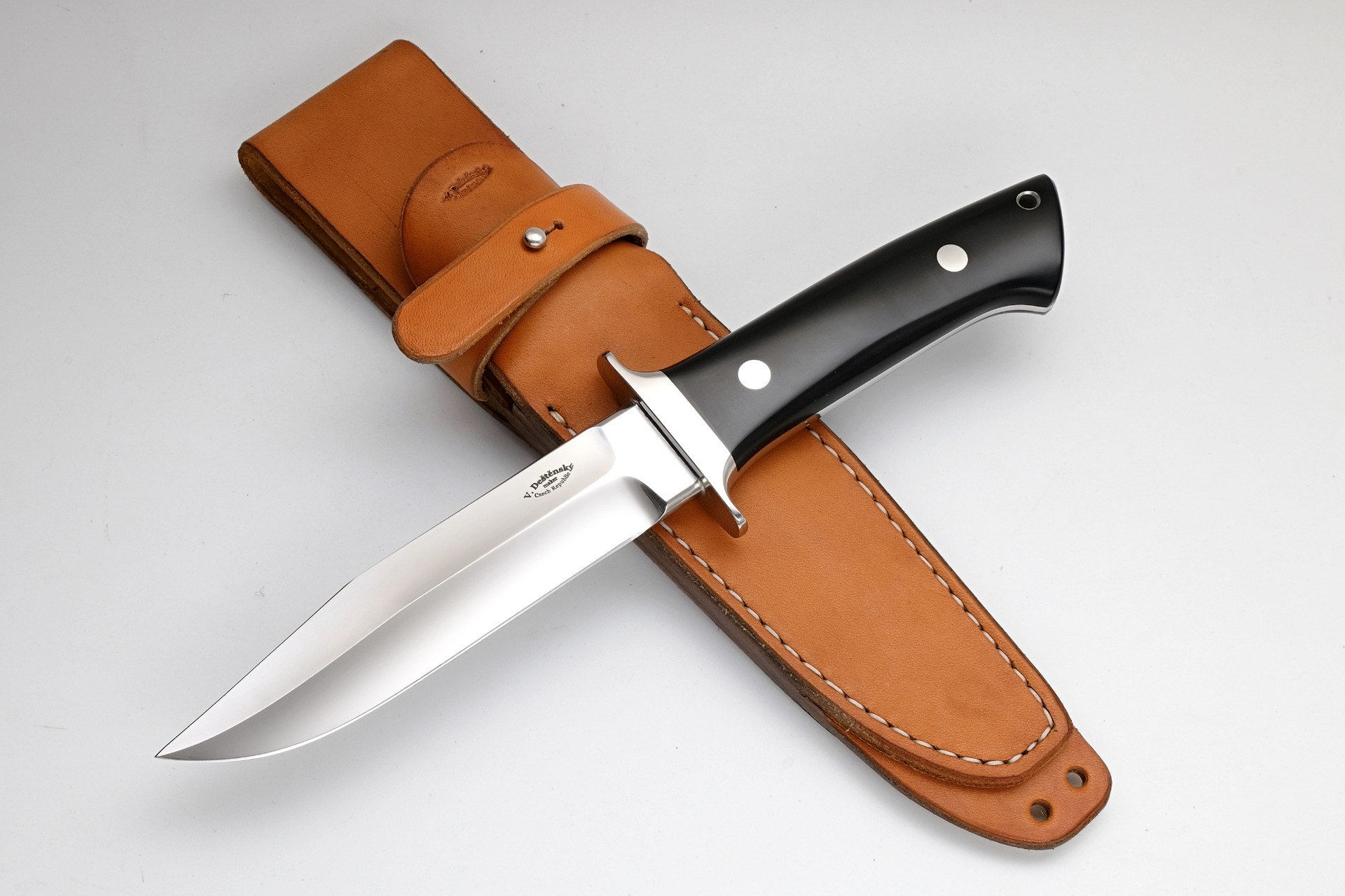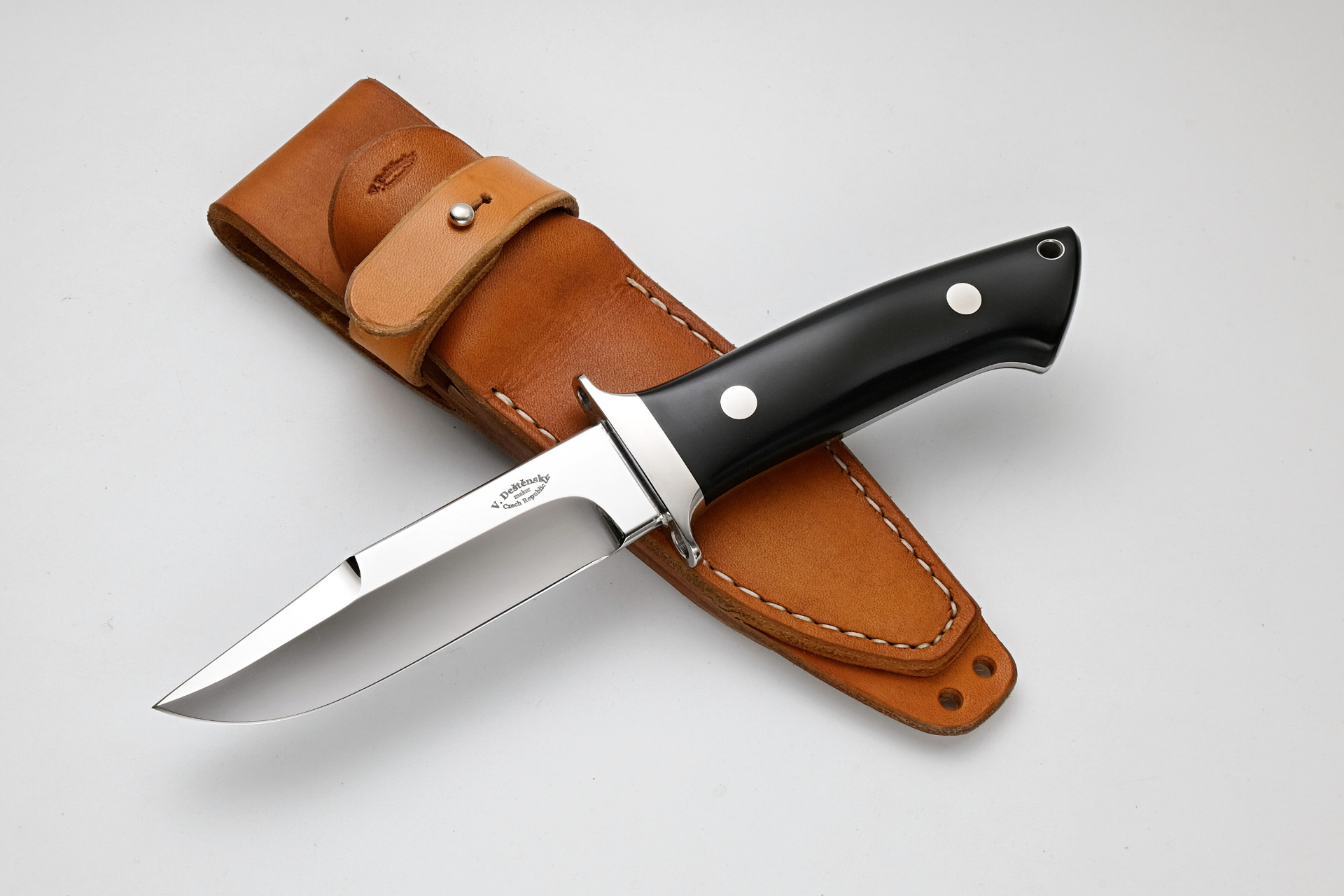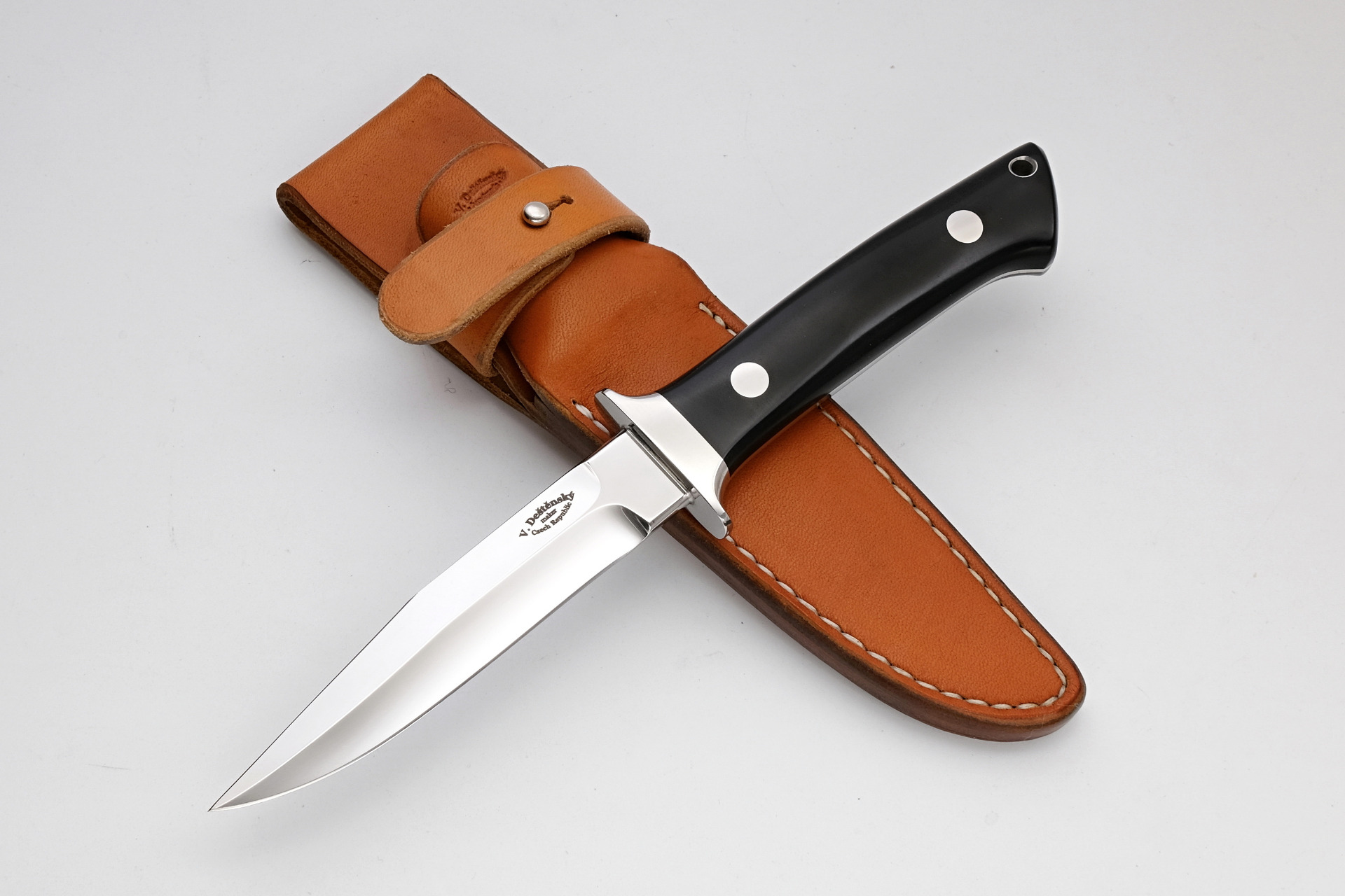 Ocel (steel) : Elmax, 60-61HRc. 6,5mm. (0.25") Celková délka (total length) : 274mm. (10,78") Délka čepele (blade length) : 144mm. (5,66") Výbrus (grind) : 2x dutý (hollow) Rukojeť (handle) : Micarta black Záštita (guard) : nerez ( stainless steel) Loveless šrouby (bolts) : nerez ( stainless steel ) Pouzdro (sheath) : ručně šité z hovězí kůže - pravák (Cow leather for right-handed)